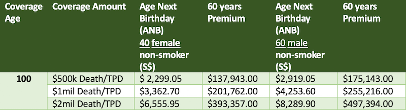 To illustrate why so, let me use the table below which shows the premiums payable for someone who is 40 years old today, both female and male, non-smoker, who buys three different coverage levels of term insurance of $500,000, $1 million and $2 million, until the grand age of 100 years old:
